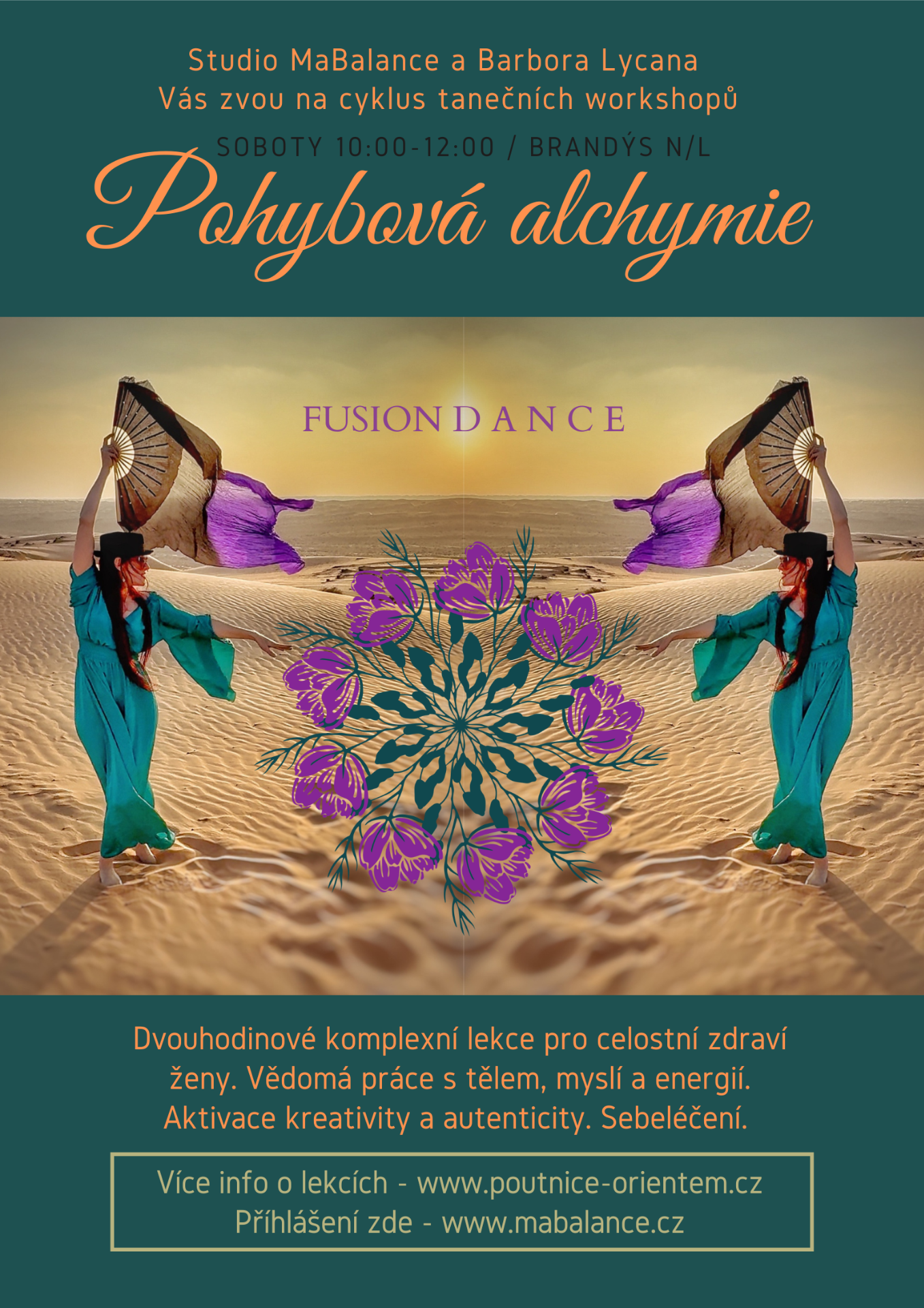 Pohybová alchymie v komplexním přístupu holistického pojetí ženy. Cyklus workshopů bude veden s kontinuálním fokusem na vnitřní záměr. Pohyb má sílu přeměny. Doporučuji si reálně ujasnit, co chceš svou pohybovou alchymií ve svém životě proměnit, co nového začít, nebo k čemu nově přistupovat. Budeme drilovat nejen tělo, ale i hlavu a vnitřní podvědomé postoje. Koncept je psychosomatický a energický na podkladě Orientálních tanců a energii ženy.